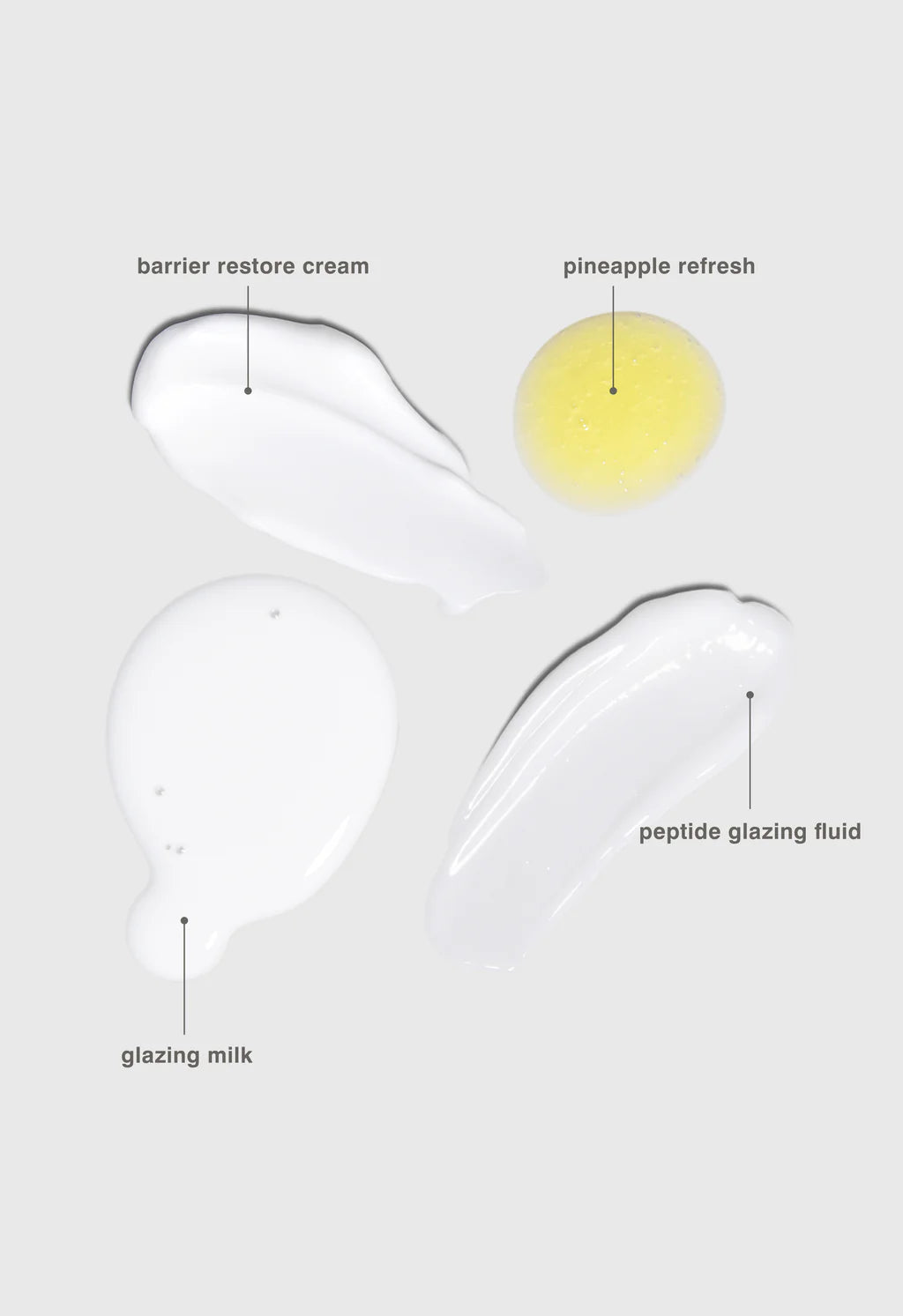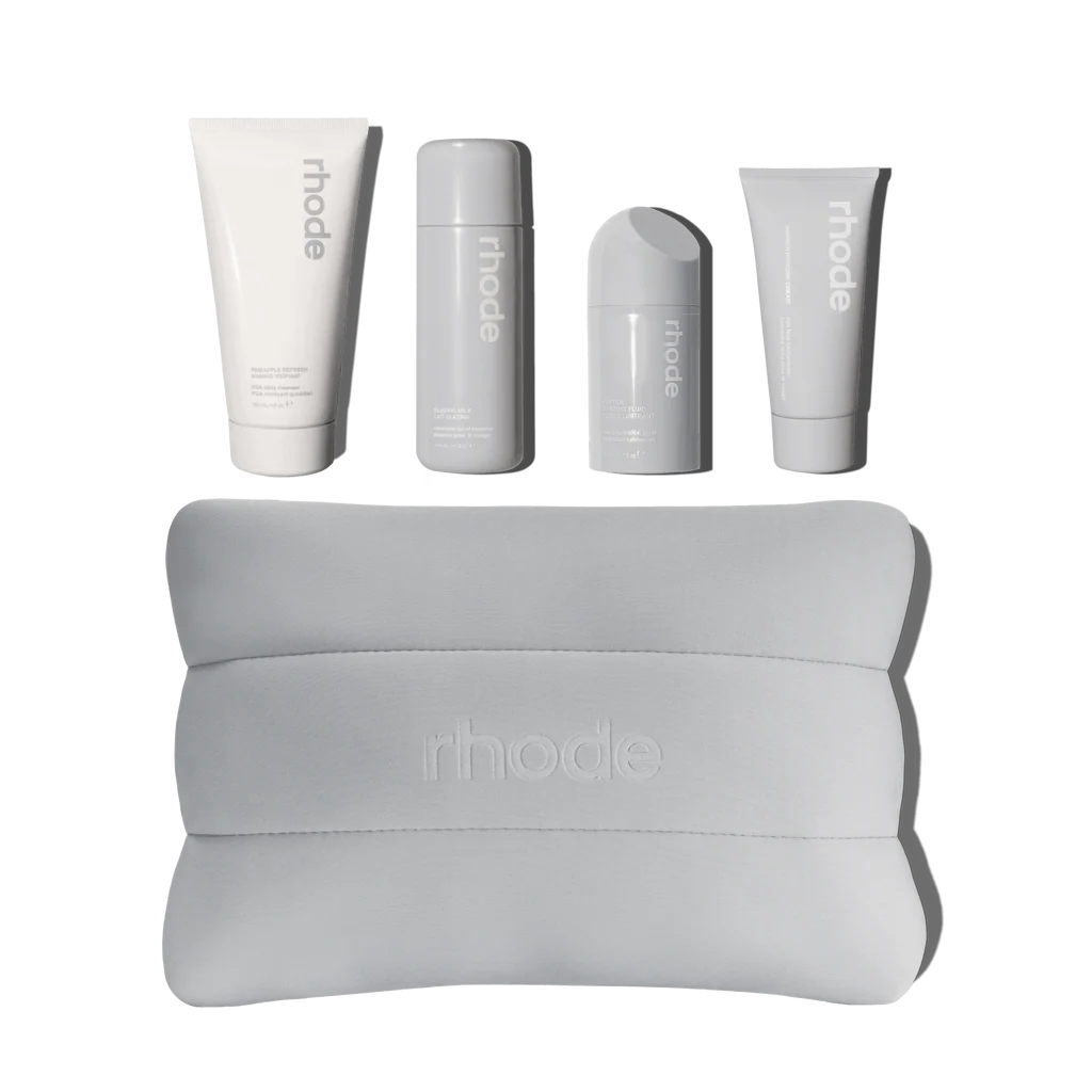The rhode kit includes 4 full size products packed in the rhode bubble bag: Pineapple Refresh, Glazing Milk, Peptide Glazing Fluid, and Barrier Restore Cream.